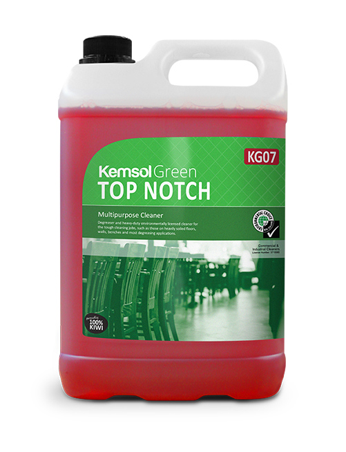 TOP NOTCH is a degreasing and heavy-duty yet environmentally accredited cleaner for the tough cleaning jobs, such as those on heavily soiled floors, walls, benches and most degreasing applications. Meets or exceeds EU biodegradability standards and meets Kemsol Green environmental standards and is Environmental Choice licensed. Properties Appearance: Clear red solution Fragrance: No fragrance Specific gravity: 1.06 pH: 11.0 (100%)