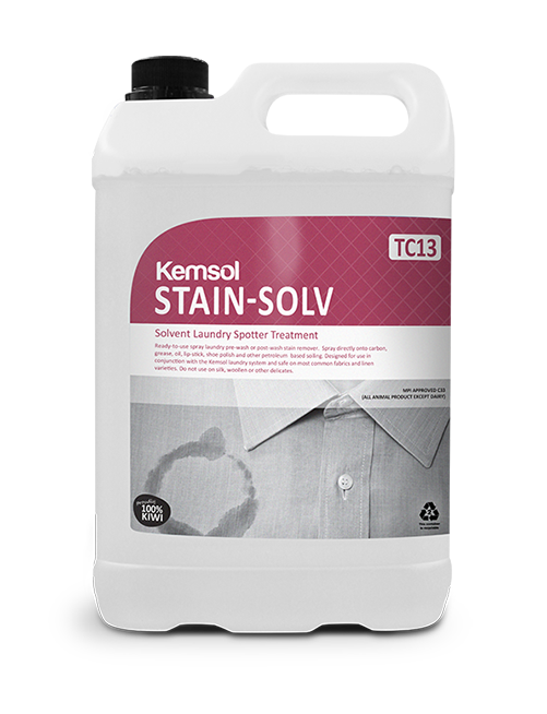 Ready-to-use spray laundry pre-wash or post-wash stain remover. Spray directly onto carbon, grease, oil, lipstick, shoe polish and other petroleum based soiling. Designed for use in conjunction with the Kemsol laundry system and safe on most common fabrics and linen varieties. Do not use on silk, woollen or other delicates. Properties Appearance: Clear colourless liquid Fragrance: Solvent Specific gravity: 0.818 pH: n/a MPI Approved C33 pH: n/a MPI Approved C33