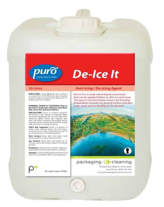 An easily mixed liquid concentrate that can be applied before or after ice and snow. It lowers the freezing temperature of water on ground surface and stops the ice and snow bonding to the surface. User friendly and harmless to plants and vegetation,