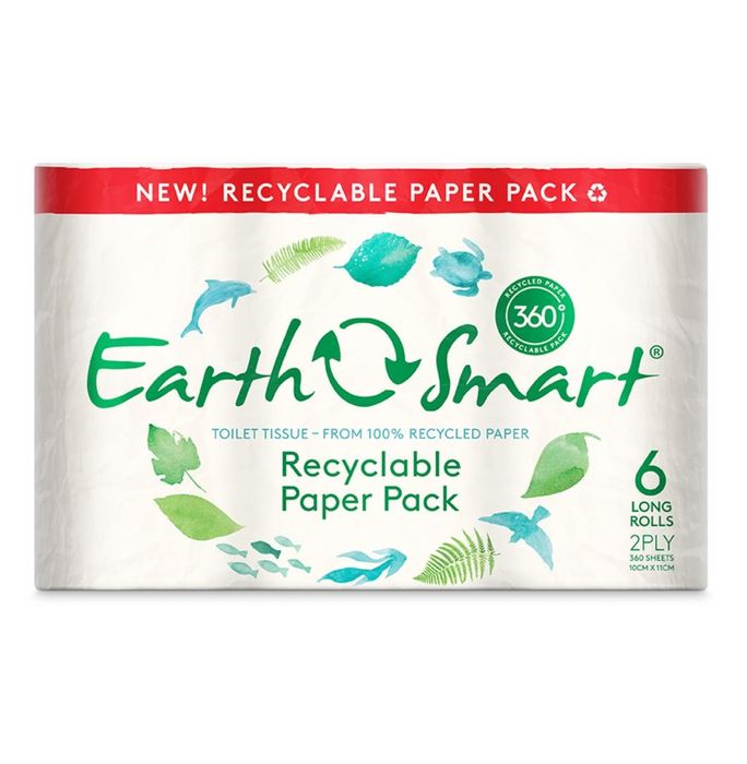EarthSmart is an environmentally friendly, locally manufactured toilet tissue. 100% recycled toilet tissue made from 100% post consumer waste. 2Ply 360/Roll, 6/Bale = 1 Unit