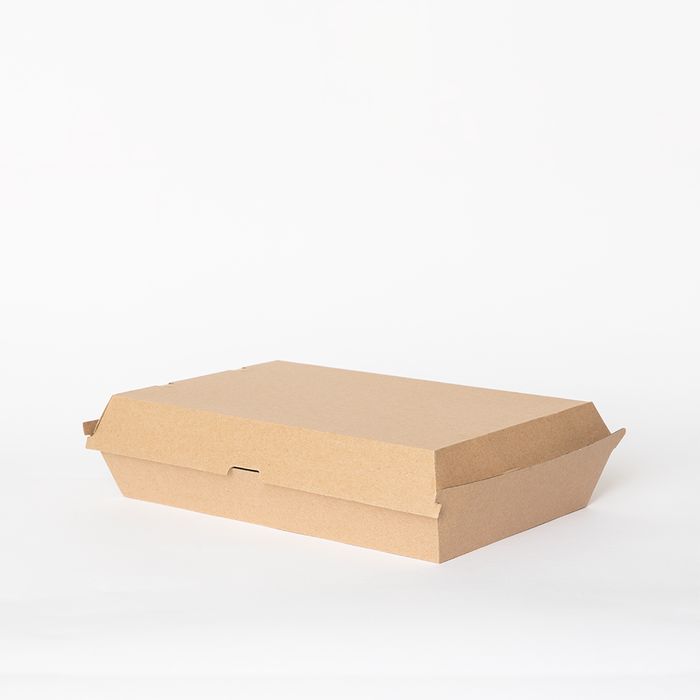 Made with a sturdy, corrugated fluted board, so it's ideal for hot and greasy foods. It's also 100% compostable making it a great choice for the environment. The family dinner box fits full meals, from steaks and schnitzels to serves of ribs and is also ideal for catering packs of foods like buffalo wings. It's offered in natural brown kraft, with space for branding with stickers or stamps. Dimensions: 290 x 170 x 85mm 4229445