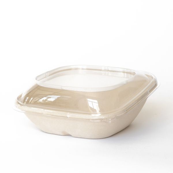 Recyclable PET Lid to suit Home Compostable Bowl (code: F1986) This lid is angled to showcase contents within the bowl when product is stacked. - Refrigerator Friendly - Freezer Friendly. Requires testing under frozen conditions - Non-Microwavable - Non-Ovenable - Durable to Reduce Crushing. Rigid when exposed to moisture in moist environments, such as in some packer processors, refrigerators and inside of freezers Dimensions: 180 x 180mm Height (Front): 30mm Height (Back): 0.5mm