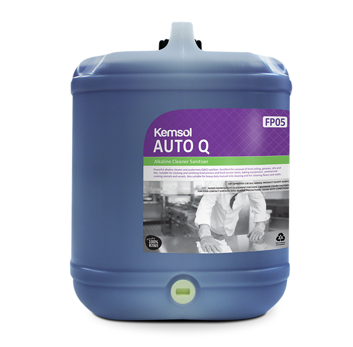 Auto-Q is a powerful alkaline cleaner combined with a quaternary (QAC)sanitiser to give a one stop cleaning and sanitising process. The product is excellent for removal of food soil such as grease, oils and fats. Auto-Q is suitable for cleaning and sanitising, sinks, floors and walls. Auto-Q may also be used on open work surfaces such as work tables that contact food, providing these can be rinsed and drained completely, in order to prevent pooling of detergent residues. Because the product contains QAC sanitiser, do not use as a Clean-In-Place (CIP) cleaner for enclosed systems, because pooling in such systems may lead to contamination by detergent residues. MPI APPROVED C38