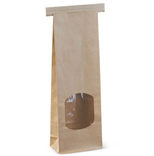 Retail window bags are poly-lined for freshness, and feature a window to showcase the contents. They're ideal for dry foods like coffee beans, loose leaf tea, biscuits, and nuts, and can be sealed with a bar heater. Polylining is 100% BPA-free. The small tin-tie bag can also be resealed with the tin-tie, and is offered in brown. Dimensions (L x G x H): 88 x 47 x 260mm